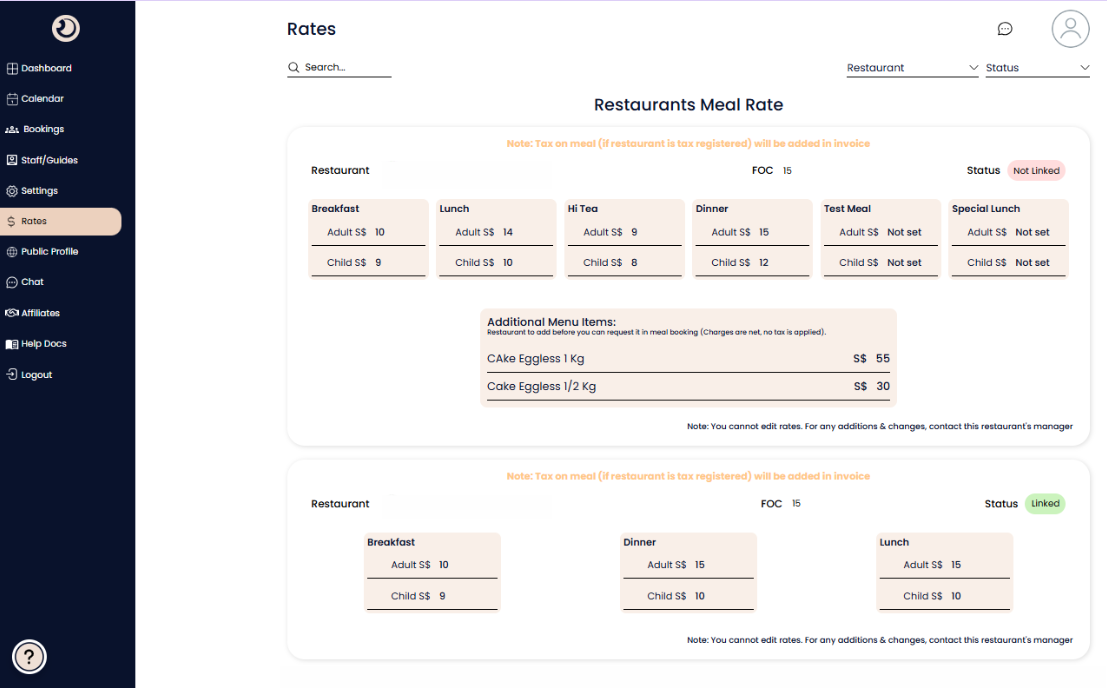 Rate Status: If a price is not yet agreed upon for a specific meal type, it will display as "Not set".