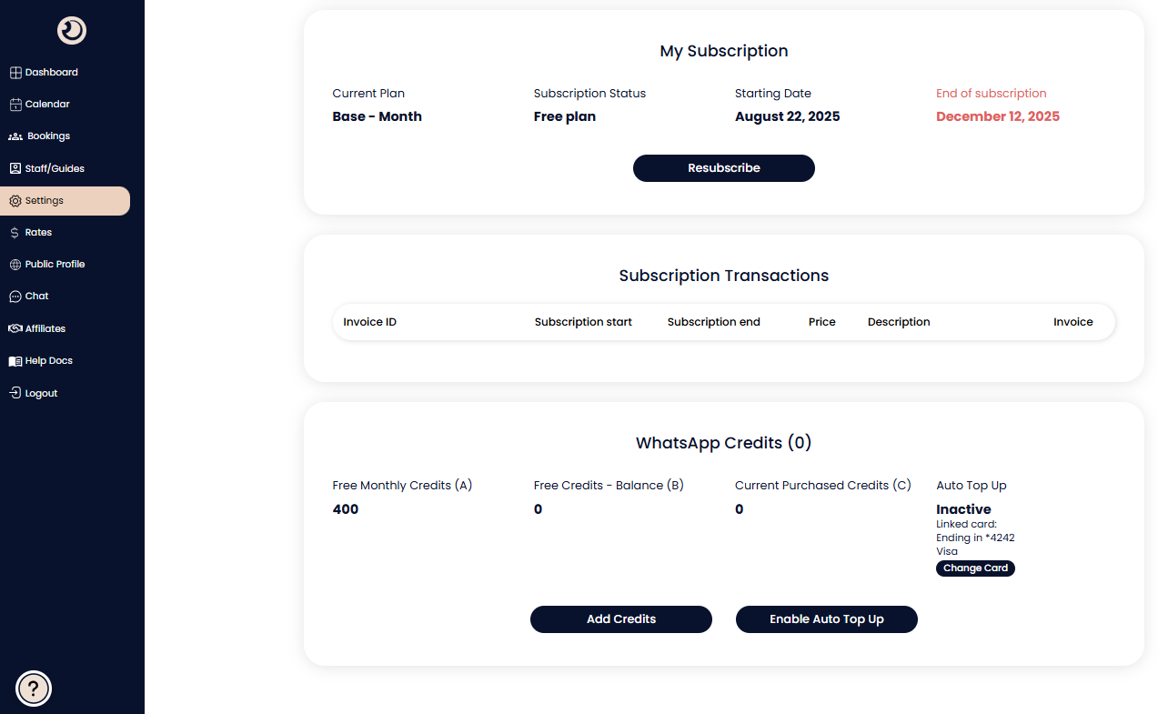 Provides full oversight of your platform service plan, payment history, and messaging credit balances.
