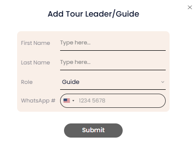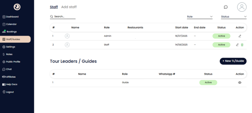 Function: The command center for managing your team roster. Use this page to onboard internal staff (who access the dashboard) and external Tour Leaders/Guides (who facilitate the guest experience).